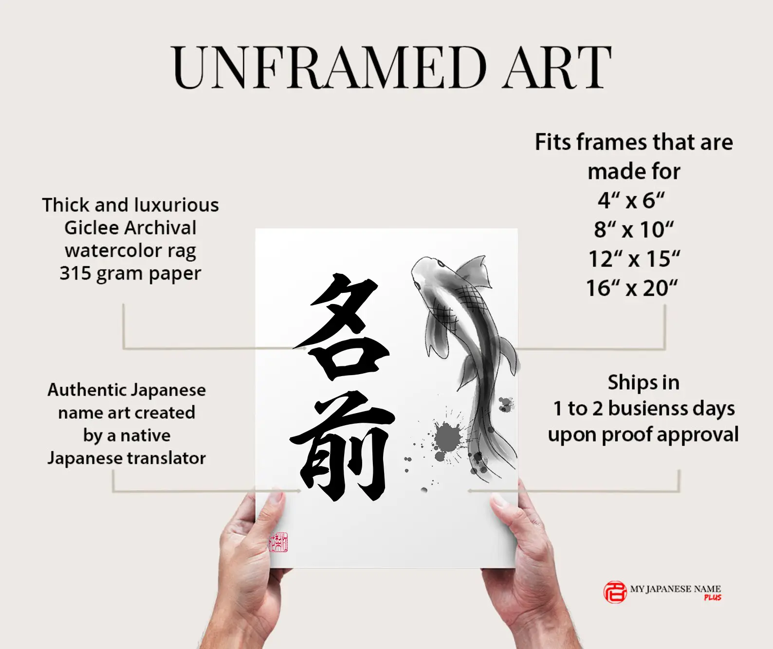Combine your name, favorite word, or meaningful phrase with the symbolic beauty of Japanese koi in this sumi-e style wall art, featuring Custom Japanese Name Calligraphy.